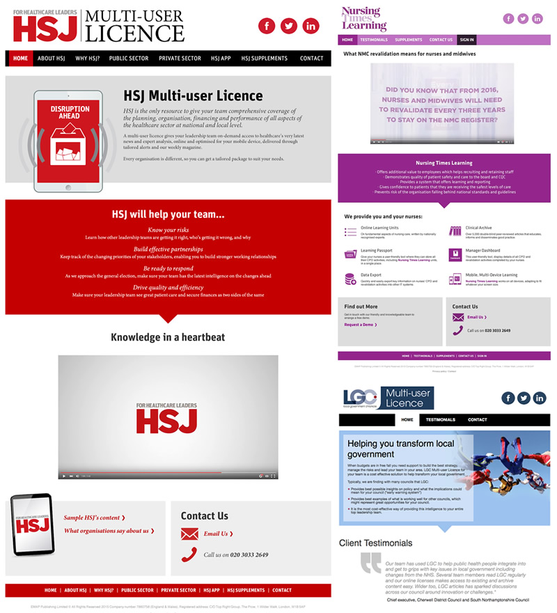 These lot are responsive microsites, which I’ve already said but you probably weren’t listening. All kind of running off the same template but with a few tweaks per brand here and there. Health Service Journal, Nursing Times and Local Government Chronicle.