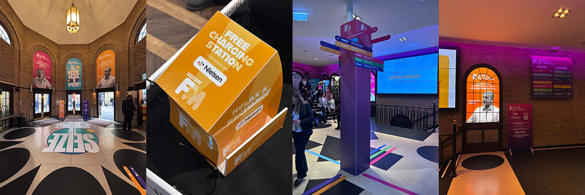 Speaking of work, I pretty much did everything. Lecterns, lanyards, app screens, the lot. Also a wrap around mobile phone charging station thing. And ‘tombstones’ which sound more goth than they actually are. They’re basically just giant free standing posters. Oh, and there was a massive, 3 metre diameter floor vinyl thing, which was a little bit different. You can also see below a rather ominous searchlight-style animation I made that served as a sort of screensaver on the main screen at the event.