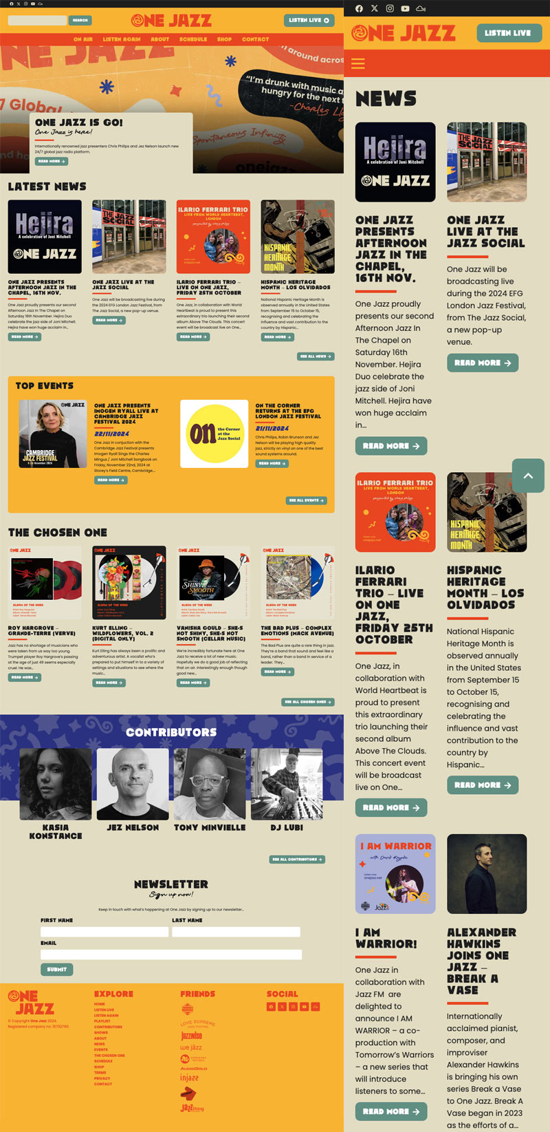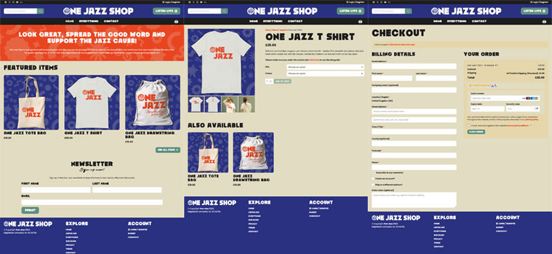 For this, we’ve got websites times two. Completely separate builds encompassing the standard One Jazz website and then their online shop. The reason for this was to keep the riff-raff from the important people. Ok, that’s not really what I mean. One Jazz is a digital radio station but operates slightly differently, in the sense that there’s a kind of open door policy, running off the altruism of volunteers. With that in mind, the schedule changes from week to week and new shows and contributors are rife.