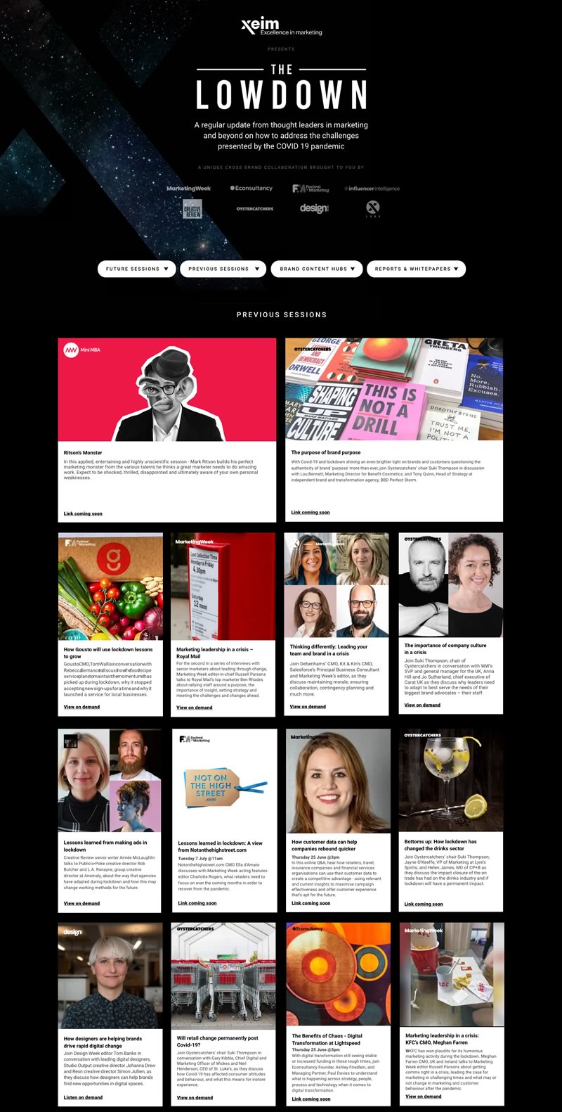 This single graphic doesn’t really do this justice, to be fair. For one, this is about half the size of the actual page (but who wants to scroll forever just to see largely similar boxes?). For two, it took approximately two months of daily updates. Each day there was at least one new seminar to put into the page, sometimes two, sometimes three. It kind of all had to be right, as it was running across multiple brands (including Marketing Week, Econsultancy, Design Week, Creative Review and many more). There were also ads to do across some of the more important sessions. And a suite of ads was seven separate units.